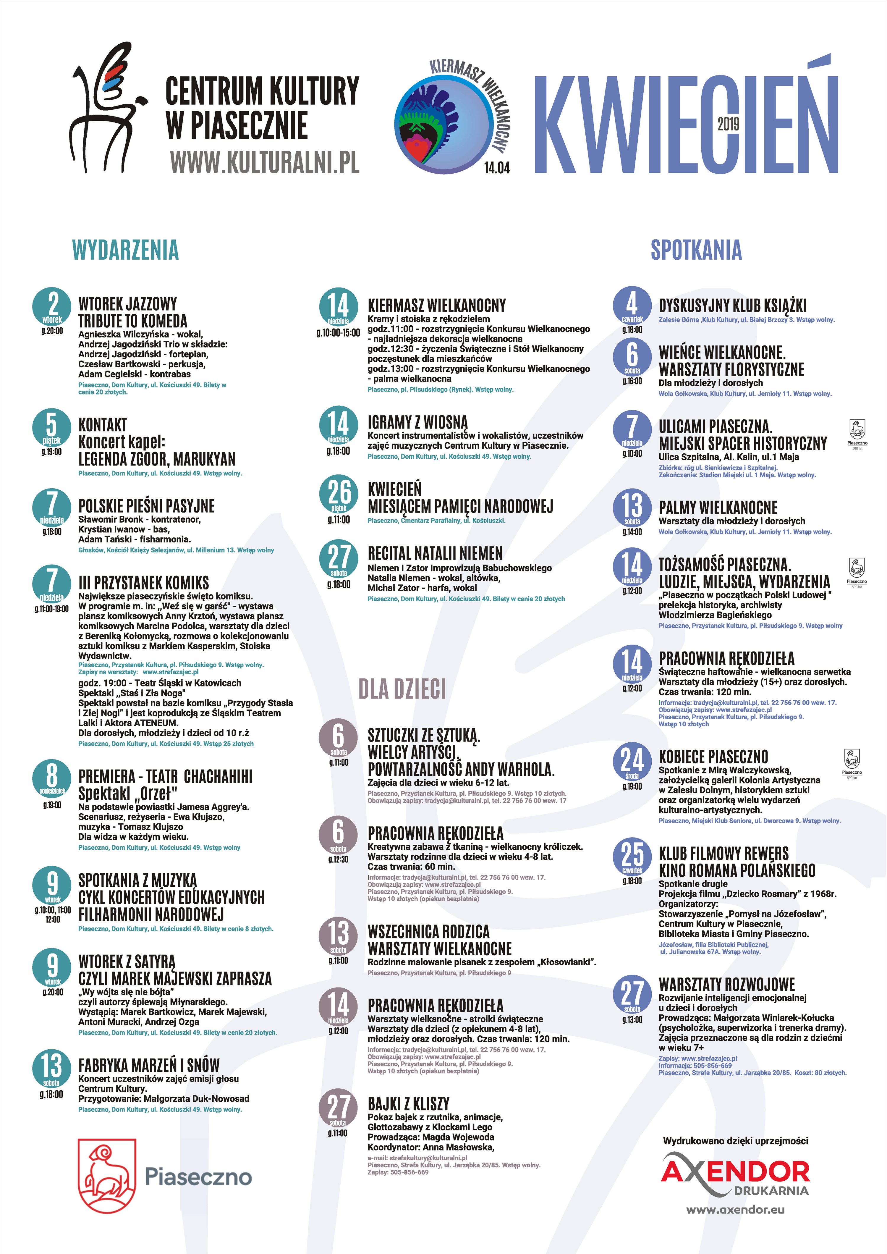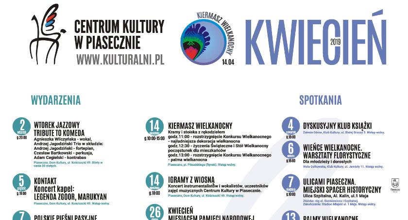 Zachęcamy wszystkich mieszkańców do zapoznania się z kalendarium wydarzeń, które Centrum Kultury w Piasecznie przygotowało na kwiecień 2019 roku.