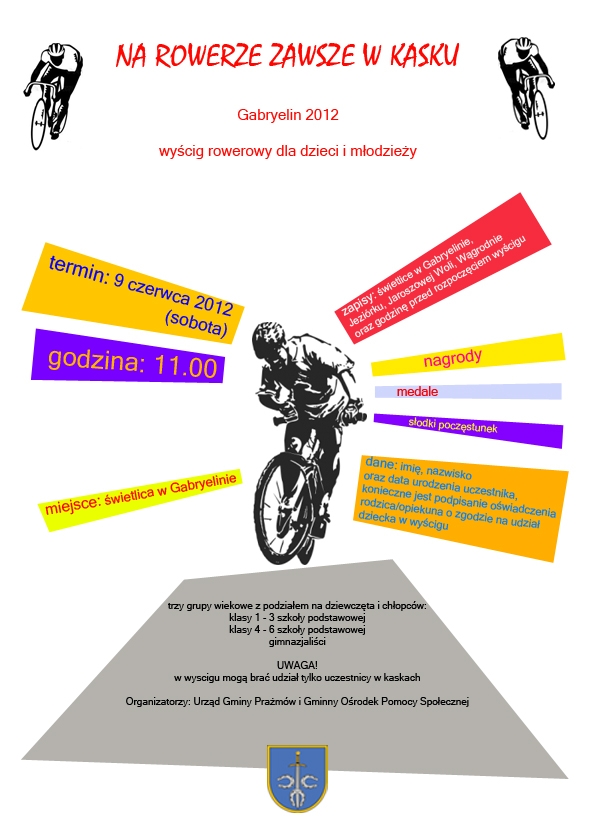 9 czerwca 2012 roku o godz. 11:00 zapraszamy na wyścig rowerowy w Gabryelinie. Warunkiem udziału jest posiadanie roweru, kasku oraz zgody rodzica/opiekuna. Wyścig odbędzie się w trzech grupach wiekowych z podziałem na chłopców i dziewczynki: klasy 1-3 szkoły podstawowej, klasy 4-6 szkoły podstawowej, gimnazjaliści. Zapisy odbywają się w świetlicach: w Gabryelinie, Jeziórku, Jaroszowej Woli, Wągrodnie oraz w miejscu wyścigu na godzinę przed rozpoczęciem.
