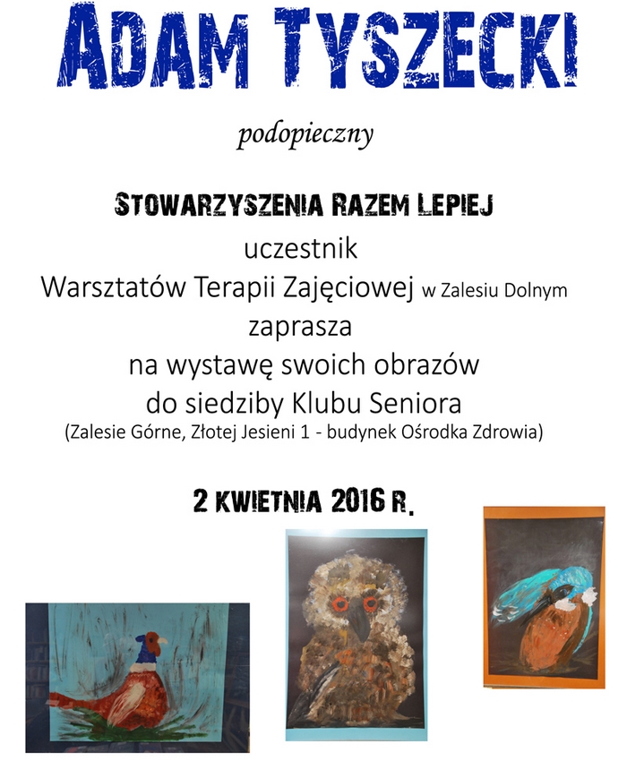 Adam Tyszecki - podopieczny Stowarzyszenia Razem Lepiej, uczestnik Warsztatów Terapii Zajęciowej w Zalesiu Dolnym, zaprasza na wystawę swoich obrazów, która dostępna będzie w sobotę 2 kwietnia 2016 r. w siedzibie Klubu Seniora Zalesie Górne ul. Złotej Jesieni 1.
