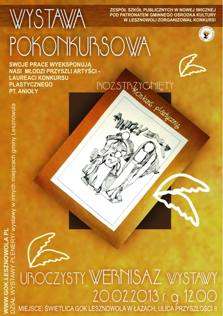 20 lutego 2013 roku o godz. 12.00 odbędzie się wernisaż dziecięcej wystawy pokonkursowej pt. Anioły. Organizatorzy: ZSP w Nowej Iwicznej pod patronatem GOK Lesznowola. Miejsce: świetlica GOK Lesznowola w Łazach, ul. Przyszłości 8. Zapraszamy!