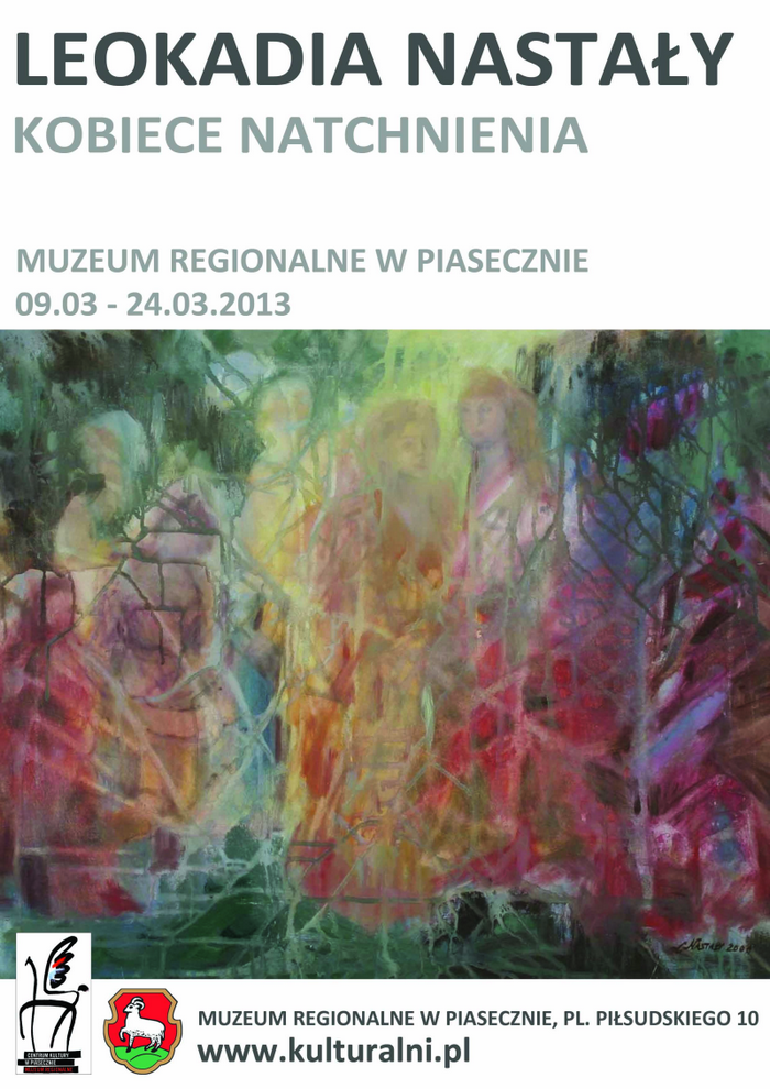 Muzeum Regionalne zaprasza na wystawę malarstwa Leokadii Nastały, malarki związanej z twórczą Grupą Piaseczno, działającą przy Centrum Kultury w Piasecznie. Wystawa czynna będzie od 9 do 24 marca 2013 r. Na wystawie zaprezentowany zostanie przegląd twórczości artystki, od początkowych realistycznych pejzaży, poprzez barwne kwiaty i obrazy o tematyce marynistycznej, do najnowszych poszukiwań twórczych - cyklu "Preludia" i cyklu błękitnego.