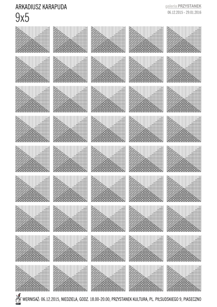 Galeria Przystanek zaprasza na wernisaż wystawy malarstwa Arkadiusza Karapuda pt. 9x5, który odbędzie się 6 grudnia 2015 r. Wernisaż zaplanowano w godz. 18.00-20.00 w Przystanku Kultura przy Pl. Piłsudskiego 9. Wystawa czynna będzie do 29.01.2016 r.