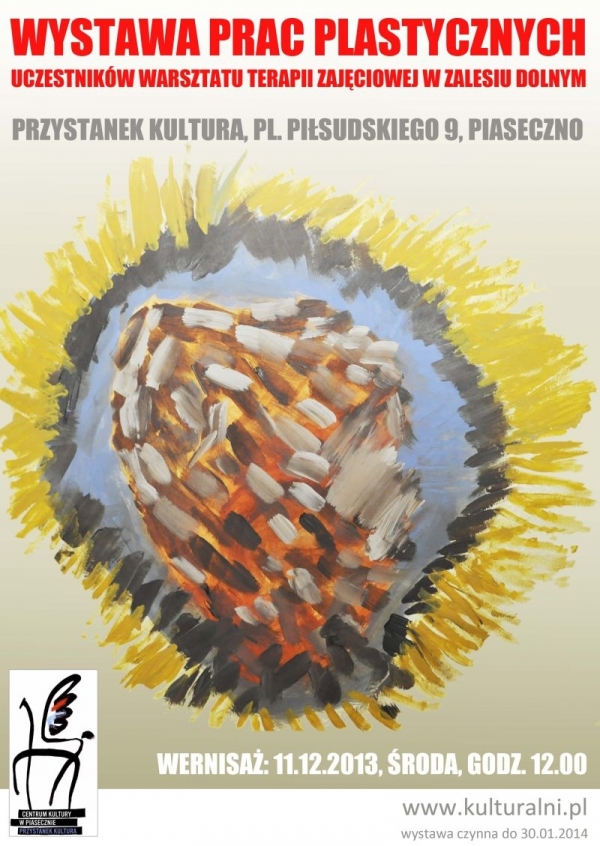 Zapraszamy na wernisaż wystawy "Prace plastyczne uczestników Warsztatu Terapii Zajęciowej w Zalesiu Dolnym", który odbędzie się w środę 11 grudnia 2013 roku o godz. 12.00 w Przystanku Kultura, Pl. Piłsudskiego 9 w Piasecznie. Wystawa potrwa do 30.01.2014 r.