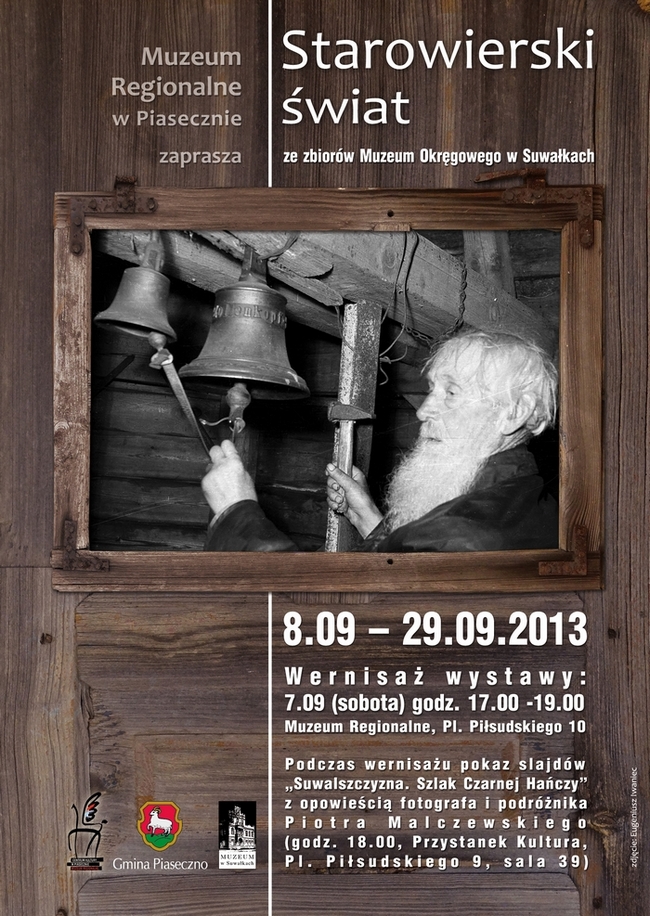 Muzeum Regionalne w Piasecznie zaprasza na wystawę "Starowierski świat" przygotowaną we współpracy z Muzeum Okręgowym w Suwałkach. Wernisaż wystawy: 7 września 2013 r. (sobota) godz. 17.00 - 19.00, Muzeum Regionalne w Piasecznie (Pl. Piłsudskiego 10) Podczas wernisażu odbędzie się pokaz slajdów "Suwalszczyzna. Szlak Czarnej Hańczy" z opowieścią fotografa i podróżnika Piotra Malczewskiego (godz. 18.00, Przystanek Kultura, Pl. Piłsudskiego 9, sala 39). Wystawę można oglądać do 29 września. Zapraszamy na wystawę do Muzeum.