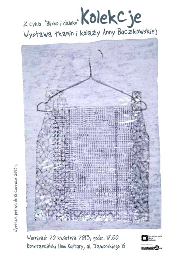 20 kwietnia 2013 roku o godz. 17.00 zapraszamy na wystawę tkanin i kolaży Anny Buczkowskiej. Miejsce: KDK, ul. Jaworskiego 18, Konstancin-Jeziorna. Tytułowe „Kolekcje” to zbiór prac, których tematyka krąży wokół motywu ubioru, jako ważnego elementu życia i ekspresji człowieka.