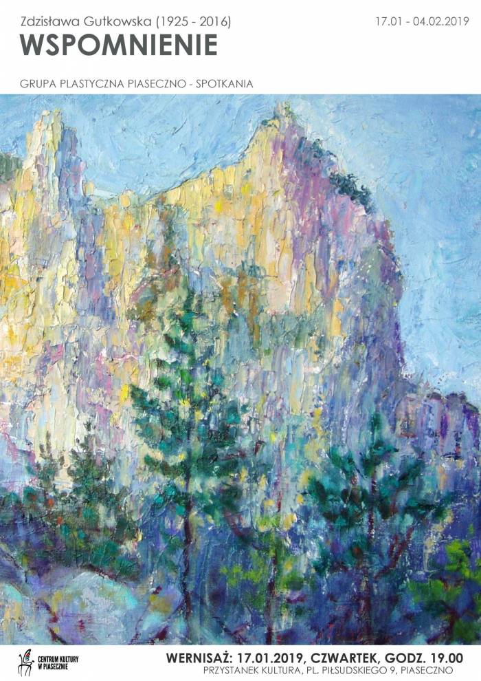 Zapraszamy na wspomnieniową wystawę członkini Grupy Plastycznej Piaseczno - Pani Zdzisławy Gutkowskiej. Wernisaż wystawy odbędzie się 17 stycznia o godz. 19.00. Miejsce: Przystanek Kultura, pl. Piłsudskiego 9 w Piasecznie. Wystawę będzie można oglądać do 4 lutego 2019 roku.