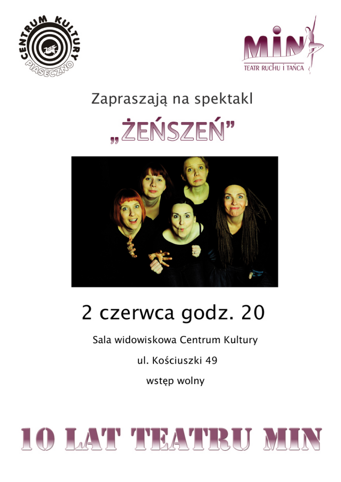 2 czerwca 2012 roku o godz. 20.00 zapraszamy na jubileusz X-lecia Teatru Ruchu i Tańca M.I.N., w ramach którego publiczność będzie mogła obejrzeć spektakl Żeńszeń wg. W. Allena. Spektakl odbędzie się w sali Domu Kultury przy ul. Kościuszki 49. Wstęp wolny.