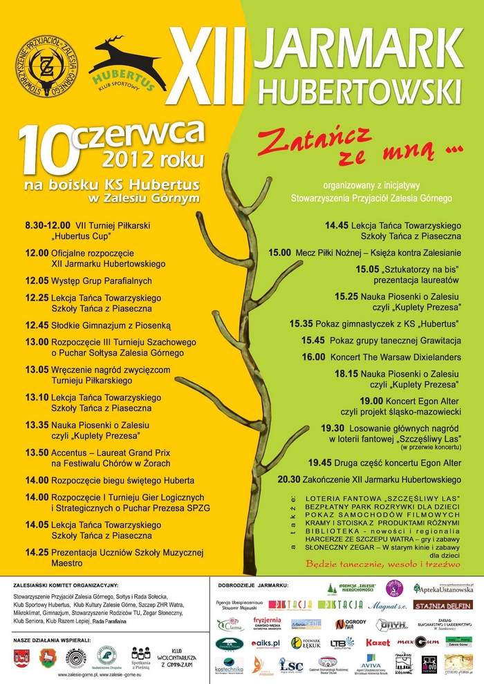 10 czerwca 2012 roku na boisku KS Hubertus w Zalesiu Górnym odbędzie się XII już Jarmark Hubertowski. Rozpoczęcie imprezy zaplanowano na godz. 12.00. W programie m.in. VII Turniej Piłkarski "Hubertus Cup", III Turniej Szachowy o Puchar Sołtysa Zalesia Górnego, nauka piosenki o Zalesiu czyli "Kuplety Prezesa", występ chóru Accentus, I Turniej Gier Logicznych i Strategicznych, prezentacja laureatów "Sztukatorów", pokaz gimnastyczek z KS "Hubertus" i pokaz taneczny grupy z KS "Grawitacja". O godz. 16.00 zapraszamy na koncert The Warsaw Dixielanders, zaś o 19.00 na scenie pojawi się Egon Alter (czyli projekt śląsko-mazowiecki). Zapraszamy do Zalesia Górnego.