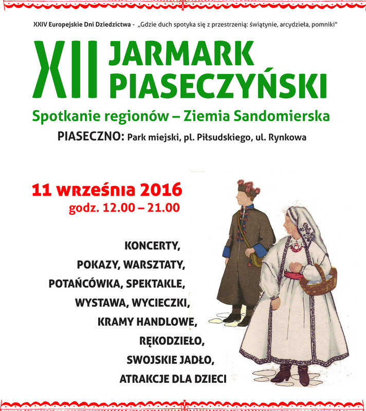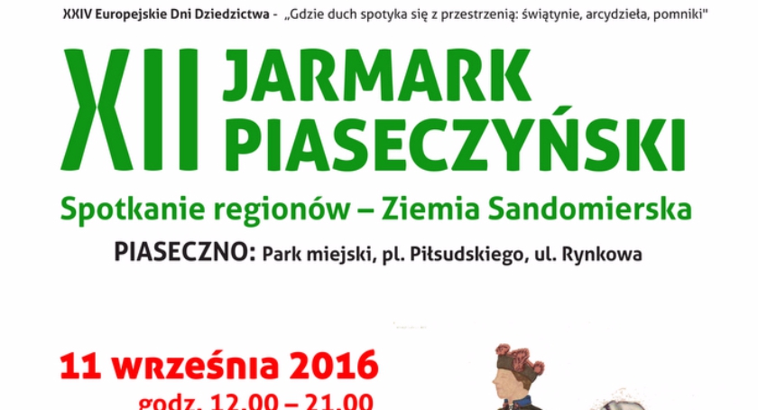 11 września 2016 r. w godz. 12.00-21.00 odbędzie się Jarmark Piaseczyński, podczas którego spotkamy ludowych twórców, zobaczymy widowisko jarmarczne, usłyszymy koncerty zespołów folkowych i zatańczymy na potańcówce.