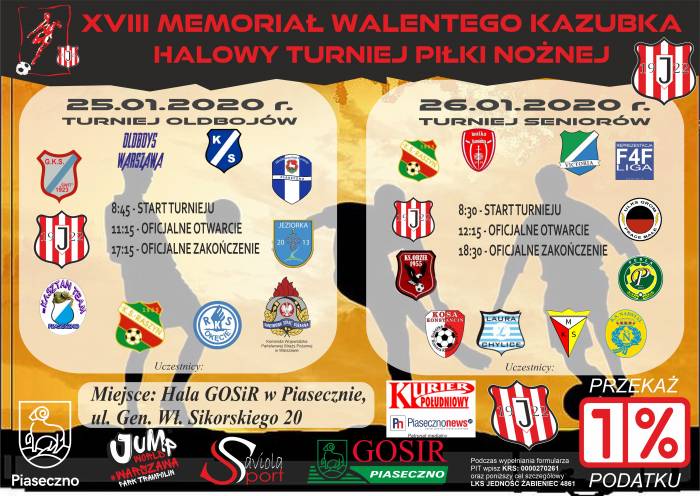 25 – 26 stycznia 2020 roku odbędzie się XVIII Memoriał Walentego Kazubka w halowej piłce nożnej, w którym udział wezmą udział 22 zespoły. Niezmiennie od lat turniej zostanie rozegrany na hali Gminnego Ośrodka Sportu i Rekreacji w Piasecznie przy ulicy Sikorskiego 20.