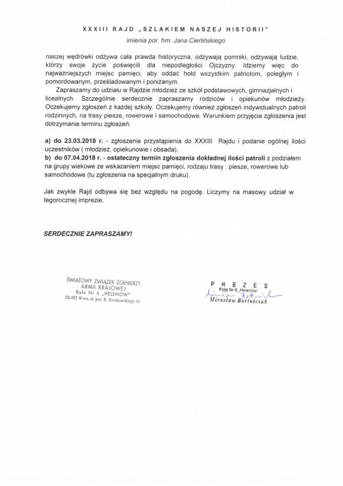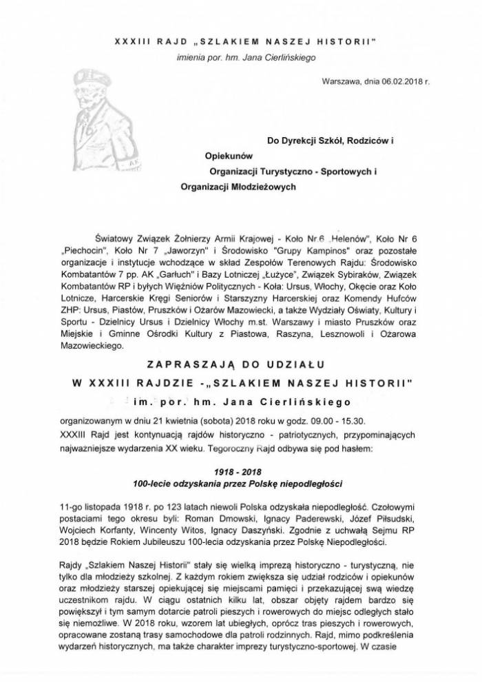 21.04.2018 r. godz. 9.00 - 15.00 - XXXIII Rajd "Szlakiem Naszej Historii" im. por. hm. Jana Cierlińskiego. Miejsce: Magdalenka i okolice