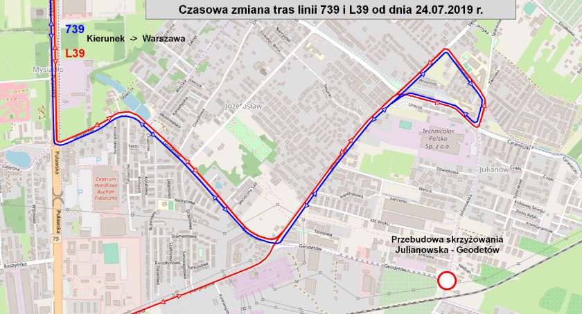 Firma “Falbruk” powiadomiła, że od 24 lipca 2019 roku rozpoczyna budowę ronda na skrzyżowaniu ul. Geodetów i ul. Julianowskiej, które znajduje się na granicy Piaseczna, Julianowa i Jóżefosławia. Zamknięcie tego skrzyżowania wymusza zmiany tras linii komunikacji publicznej 739 i L39.