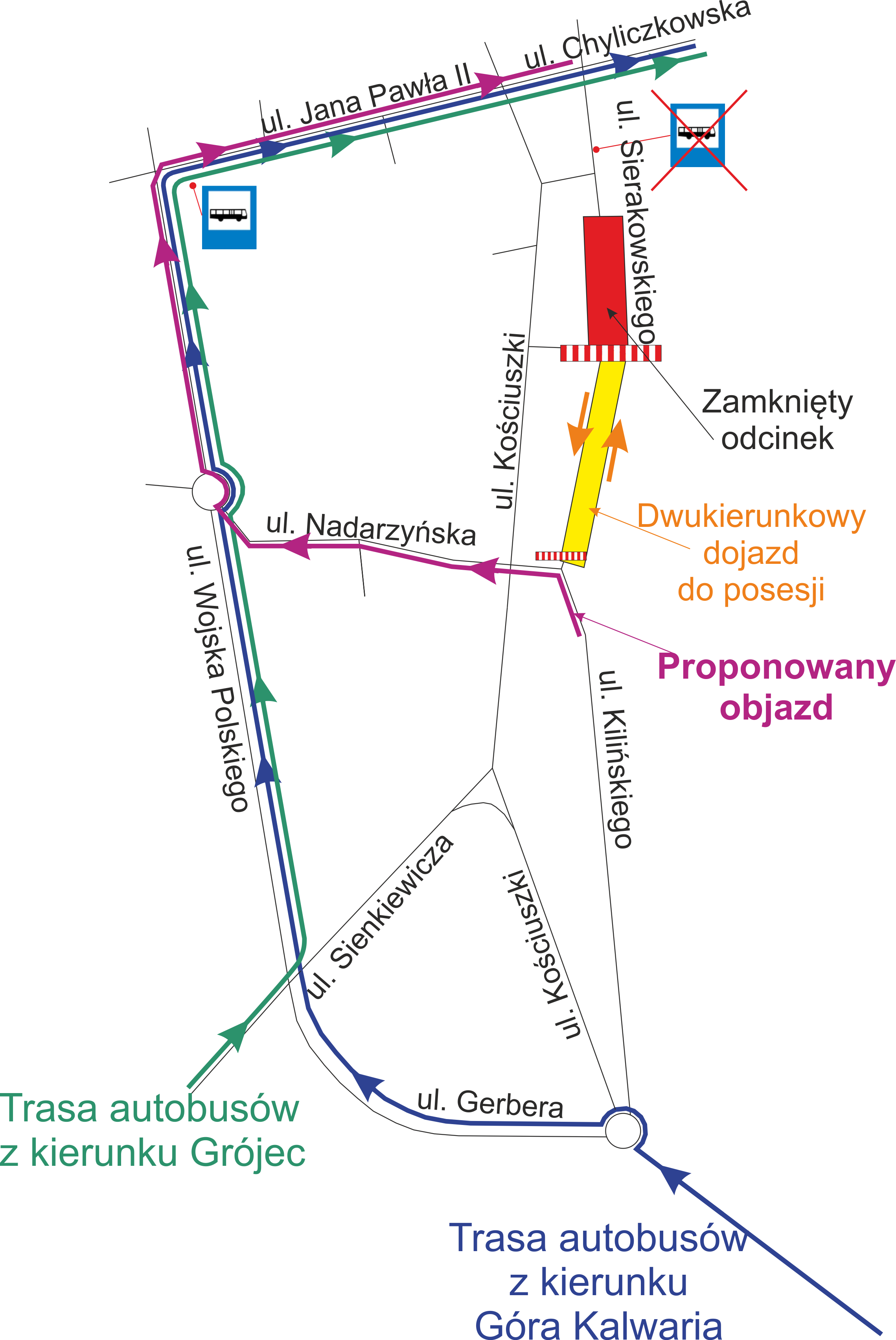 Zmianie ulegną też trasy autobusów. Linie ZTM z ulicy Sienkiewicza skręcą w ul. Wojska Polskiego a następnie w ul. Jana Pawła II i pojadą dalej prosto ul. Chyliczkowską do DK 79. Linie PKS z kierunku Góry Kalwarii na rondzie Solidarności skierowane zostaną na ul. Gerbera a następnie tak jak linie ZTM pojadą ul. Wojska Polskiego, Jana Pawła II i Chyliczkowską. Szczegóły tras autobusów prezentuje załączona mapka. Przystanek u zbiegu ul. Jana Pawła II i Wojska Polskiego przejmie rolę tymczasowo skasowanego przystanku przy Urzędzie Miasta na ul. Sierakowskiego.