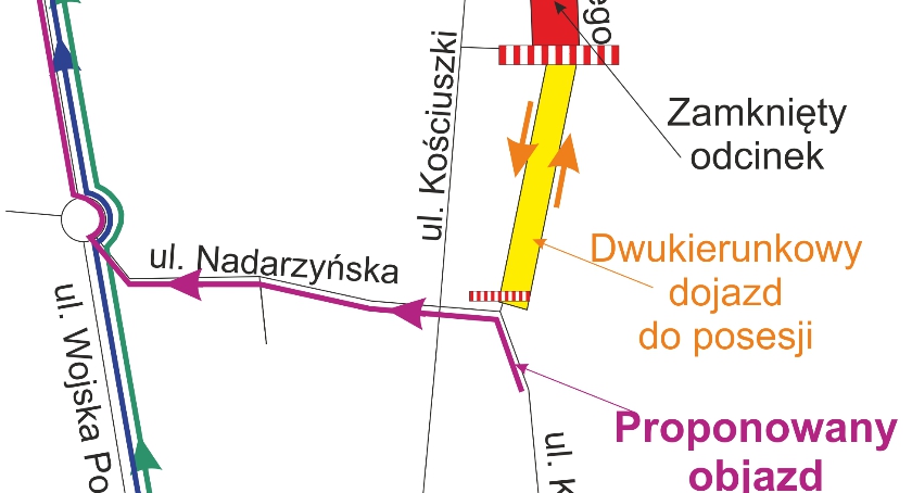 Ruch pojazdów od strony południowej skierowany zostanie objazdem prowadzącym ul. Nadarzyńską do ul. Wojska Polskiego a następnie ul. Jana Pawła II i Chyliczkowską do ul. Warszawskiej. Szczegóły objazdu pokazuje załączona mapka.