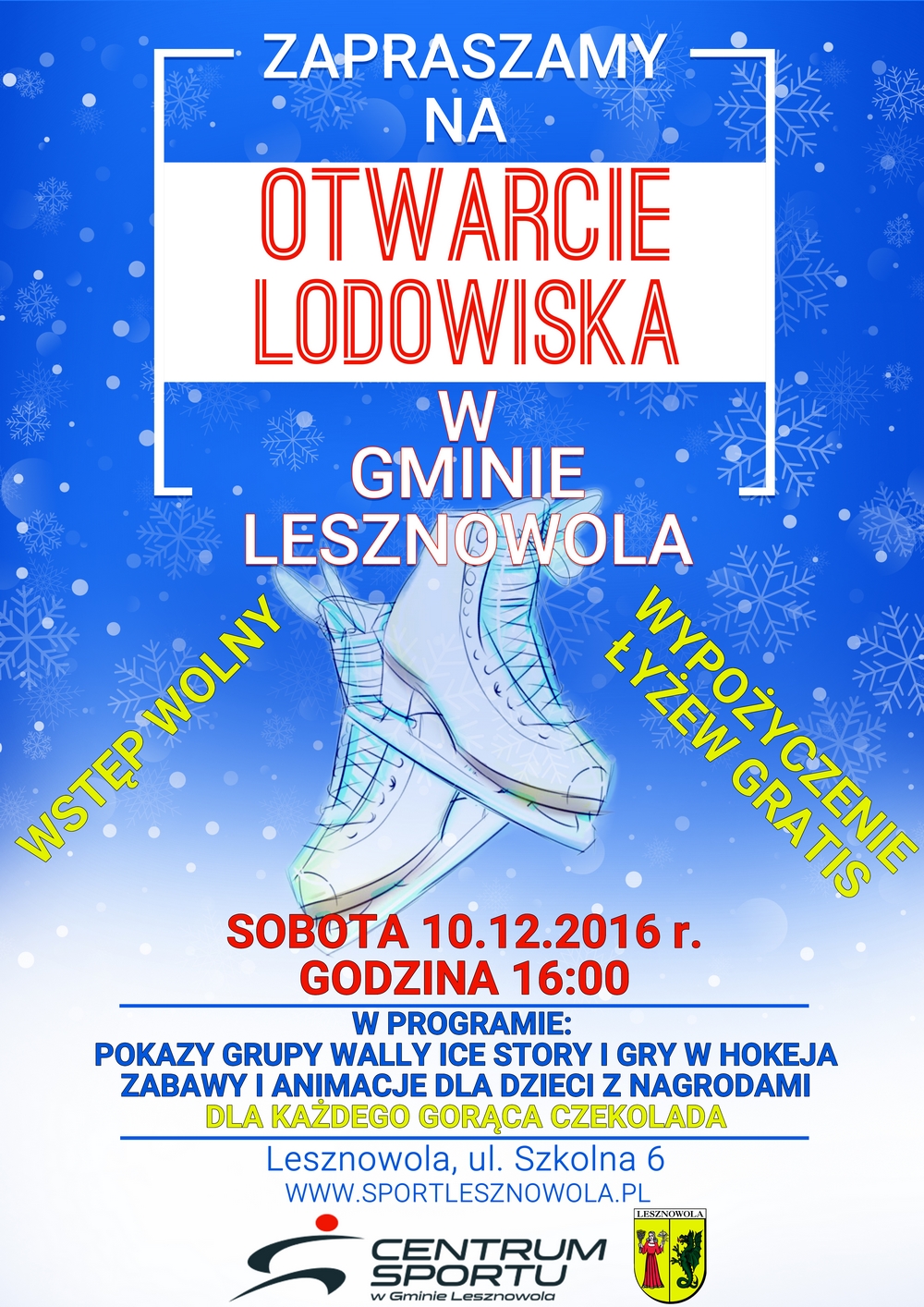 W imieniu organizatorów serdecznie zapraszam na uroczyste otwarcie LODOWISKA w Lesznowoli, które odbędzie się w sobotę 10 grudnia o godzinie 16.00. (ul. Szkolna 6, na stadionie sportowym). W programie m.in. pokazy jazdy figurowej na lodzie i gry w hokeja. Dla wszystkich - wstęp i gorąca czekolada gratis!
