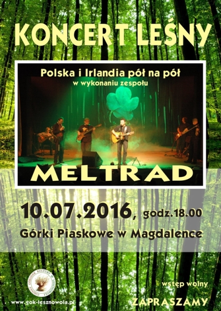 10.07.2016 r. o godz. 18.00 odbędzie się pierwszy z trzech tego lata Koncert leśny na Górkach Piaskowych w Magdalence. Wystąpi zespół MELTRAD, zapraszając w świat piosenki irlandzkiej. Szczegóły na plakacie: