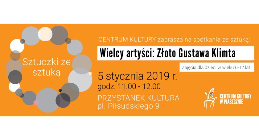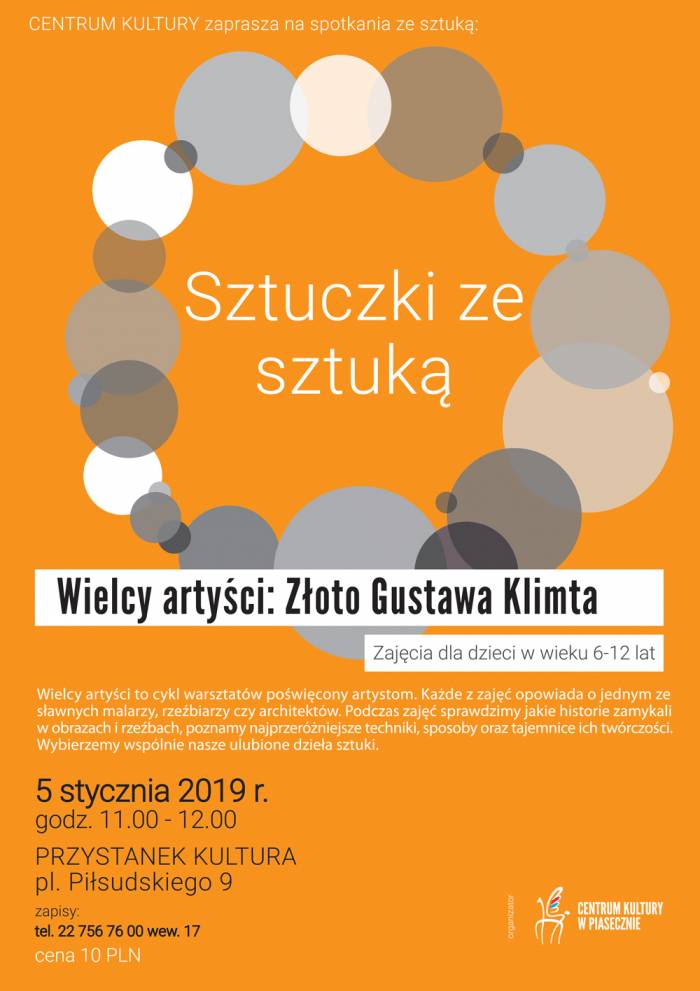 5 stycznia 2019 roku w godz. 11.00-12.00 zapraszamy na spotkanie ze sztuką - wielcy artyści: Złoto Gustawa Klimta. Zajęcia przeznaczone dla dzieci w wieku 6-12 lat. Miejsce: Przystanek Kultura przy placu Piłsudskiego 9 w Piasecznie. Wstęp 10 zł. Zapraszamy! Zapisy: [email protected] lub 22 756 76 00 wew. 17