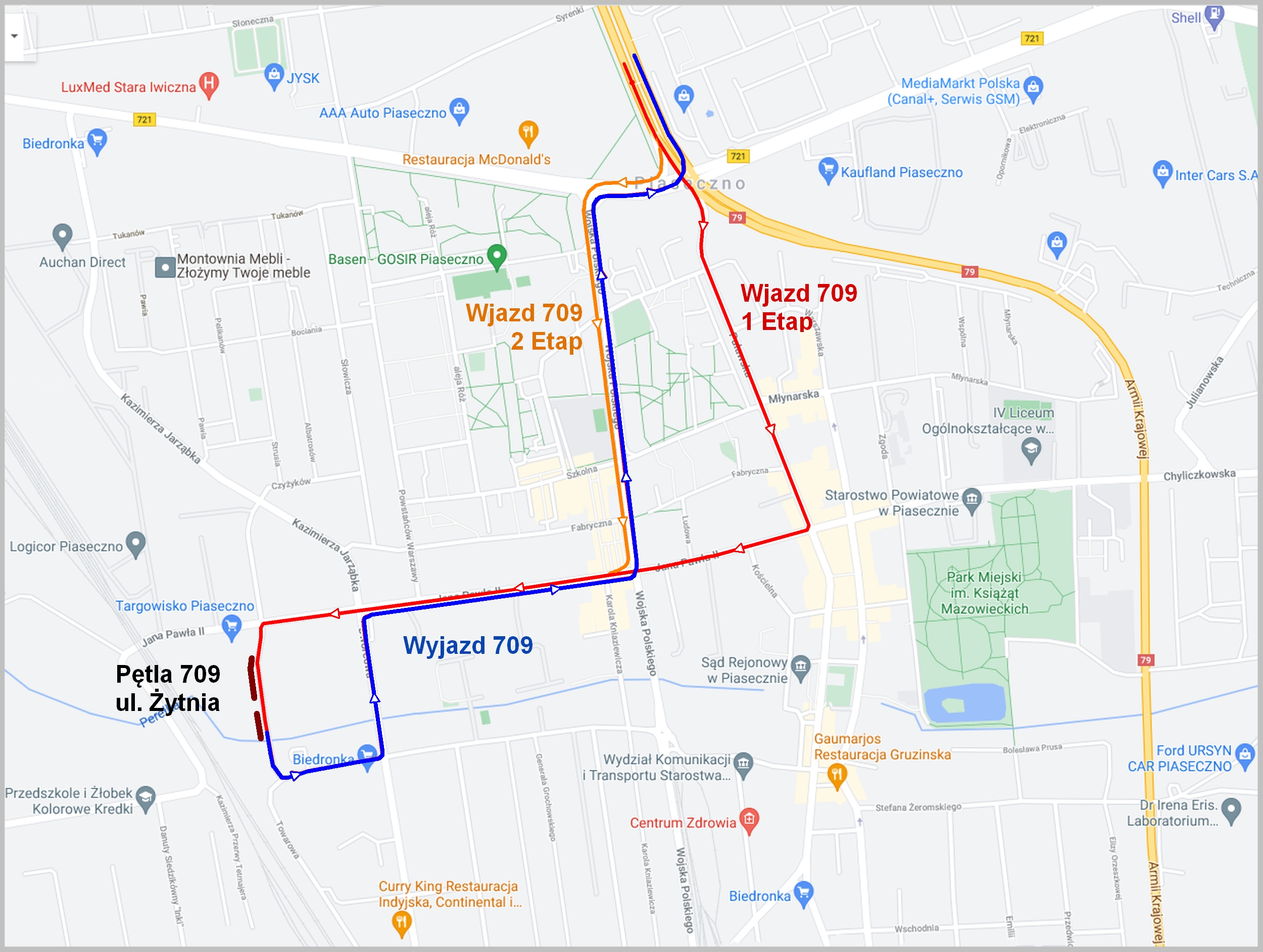 Na przełomie czerwca i lipca 2021 roku, w kolejnym etapie prac czasowo zlikwidowany zostanie przystanek „Szkolna 01″. W tym samym okresie rozpoczną się również roboty w ul. Dworcowej na odcinku od ul. Nadarzyńskiej do al. Lotników. W związku z tym wszystkie autobusy linii 709, zarówno te, które obecnie kończą trasę na przystanku “Szkolna 01”, jak i te dojeżdżające do dworca PKP, zostaną skierowane na tymczasowy przystanek przy ul. Żytniej, w sąsiedztwie targowiska. Z zatoki przy ul. Żytniej linia 709 w kierunku Warszawy pojedzie ulicami Nadarzyńską i Dworcową, a dalej podstawową trasą przez ul. Jana Pawła II i ul. Wojska Polskiego.