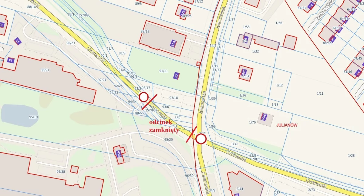 W związku z pierwszym etapem przebudowy skrzyżowania ulic Cyraneczki i Julianowskiej w Józefosławiu, od piątku 20.03.2026 r. do odwołania zamknięty dla ruchu zostaje zachodni wlot ul. Cyraneczki w ul. Julianowską.