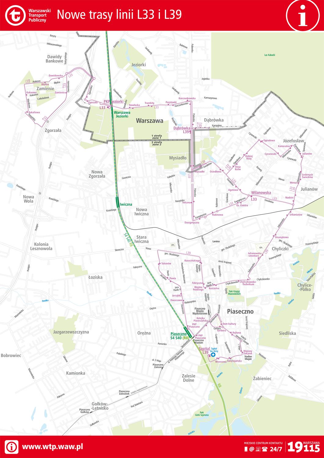 Nowe połączenie zyskają też mieszkańcy Józefosławia i Zamienia – linia L33 zostanie wydłużona. Niebieskie autobusy, po przejechaniu przez osiedla po północnej stronie Trasy S7, dojadą do ul. Puławskiej i dalej przez ul. Energetyczną do Józefosławia, gdzie zrobią „okrążenie” przez Julianów, by wrócić do przystanku Wilanowska, przy rondzie Praw Kobiet.