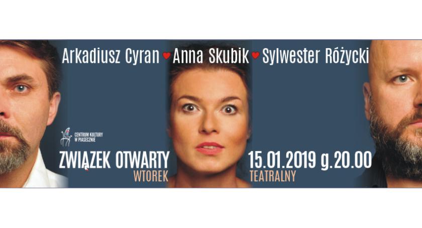 15 stycznia 2019 roku o godz. 20:00 zapraszamy na spektakl pt.: "Związek Otwarty", który będzie można obejrzeć w ramach Wtorku Teatralnego. Miejsce: sala widowiskowa Domu Kultury w Piasecznie, ul Kościuszki 49. Bilety: 20 PLN.