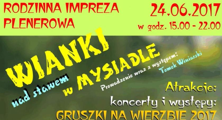 24.06.2017 r. godz. 15.00-22.00 - Wianki w Mysiadle - rodzinna impreza plenerowa oraz przegląd GOK "Gruszki na Wierzbie 2017". Gwiazda wieczoru: zespół ŻYWIOŁAK. Organizatorzy: GOK Lesznowola, Panie Przodem, Sołectwo Mysiadło pod patronatem Wójta i Samorządu Gminy Lesznowola. Miejsce: nad stawem w Mysiadle.