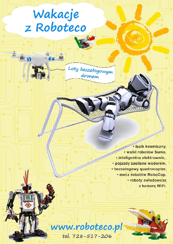 Półkolonie letnie!Zapraszamy na półkolonie z robotyką oraz półkolonie z eksperymentami dla dzieci i młodzieży w wieku 5 - 14 lat, które będą odbywały się od poniedziałku do piątku podczas wakacji 2015 w Piasecznie i okolicach. Podczas wakacji z Roboteco uczestnicy:* zbudują najprawdziwsze roboty kroczące, mobilne, walczące, przemysłowe z Lego Mindstorms,* będą programować roboty w przyjaznym środowisku dostosowanym do najmłodszych pasjonatów robotyki,* zaprojektują robota według własnego pomysłu,* wezmą udział w pełnych emocji zawodach robotów,* będą sterować profesjonalnym bezzałogowym dronem,* zbudują i zaprogramują elektrownie słoneczną i wiatrową oraz przeprowadzą liczne doświadczenia z ich wykorzystaniem.Podczas wakacji z Madlabs uczestnicy:* przeprowadzą własnoręcznie najbardziej widowiskowe i zaskakujące doświadczenia chemiczne,* będą posługiwać się profesjonalnym sprzętem laboratoryjnym oraz bezpiecznymi substancjami i materiałami,* wykonają badania, eksperymenty i pomiary w oparciu o modele skonstruowane z klocków Lego,* będą przewidywać wyniki, opracowywać i przedstawiać efekty badań na komputerach,* przygotują i obejrzą preparaty mikroskopowe, * wcielą się w rolę chemików, fizyków i biologów.Oferowane terminy kursów:29 czerwca 3 lipca Klub Zdolnego Dziecka w Piasecznie, ul. Rejtana 86 lipca 10 lipca Szkoła w Mysiadle (CEiS) ul. Kwiatowa 20 lipca 24 lipca Szkoła w Mysiadle (CEiS) ul. Kwiatowa 3 sierpnia 7 sierpnia Klub Zdolnego Dziecka w Piasecznie, ul. Rejtana 817 sierpnia 21 sierpnia Klub Zdolnego Dziecka w Piasecznie, ul. Rejtana 8