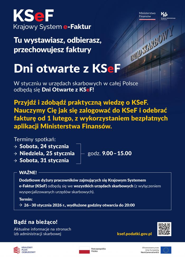 31 stycznia organizowane są w siedzibie Urzędu Dni Otwarte z KSeF skierowane do mieszkańców Państwa gminy. Jednocześnie w ramach planowanego wydarzenia, w siedzibie Urzędu, w godzinach 11.00-12.00 zaplanowane są szkolenia z zakresu Krajowego Systemu e-Faktur (KSeF) skierowane do zainteresowanych osób.
