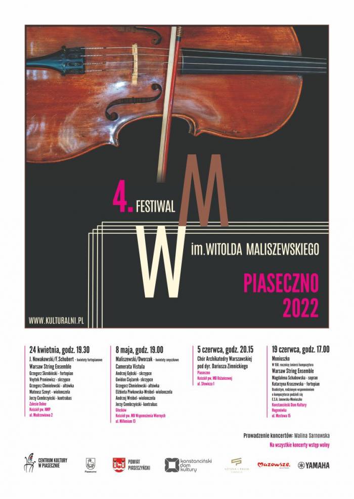 24 kwietnia, 8 maja, 5 czerwca, 19 czerwca 2022 roku odbędzie się Festiwal im. Witolda Maliszewskiego. Wstęp wolny. Miejsce: Kościoły dekanatu piaseczyńskiego. Organizatorzy: Centrum Kultury w Piasecznie, Fundacja Pasja i Sztuka. Wydarzenie współfinansowane z budżetu Samorządu Województwa Mazowieckiego