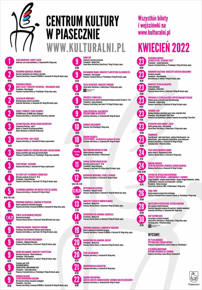Zachęcamy mieszkańców do zapoznania się z kalendarium wydarzeń, które Centrum Kultury w Piasecznie organizuje w kwietniu 2022.