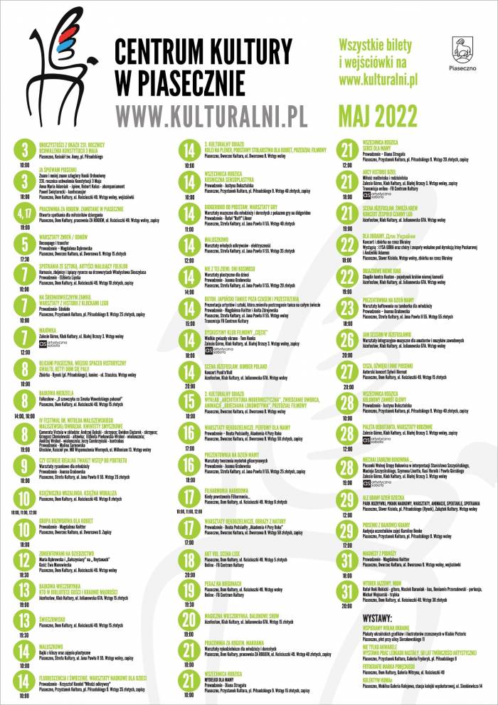Zachęcamy mieszkańców do zapoznania się z kalendarium wydarzeń, które Centrum Kultury w Piasecznie organizuje w maju 2022.